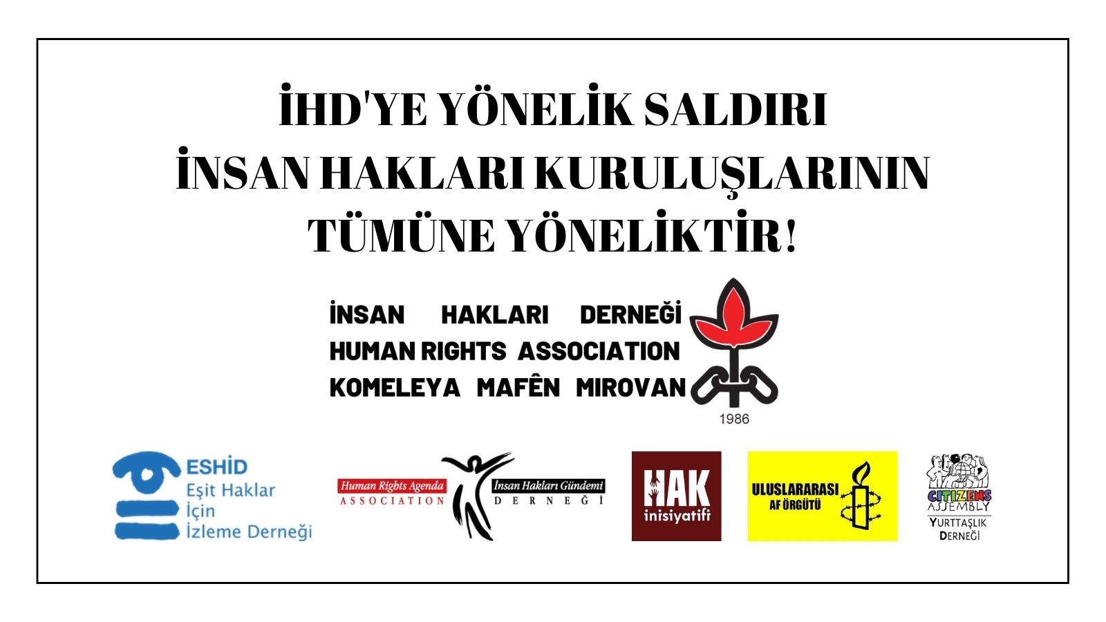 Bizler, İnsan Hakları Derneği’ne yapılan bu saldırıları, insan hak ve özgürlükleri için faaliyet gösteren bütün sivil toplum örgütlerine da yapılmış olarak değerlendiriyoruz. Tüm susturma, yıldırma ve sindirme çabalarına rağmen insan hak ve özgürlüklerini korumak ve hak ihlallerini engellemek için İnsan Hakları Derneği ile yan yana çalışmaya devam edeceğiz.