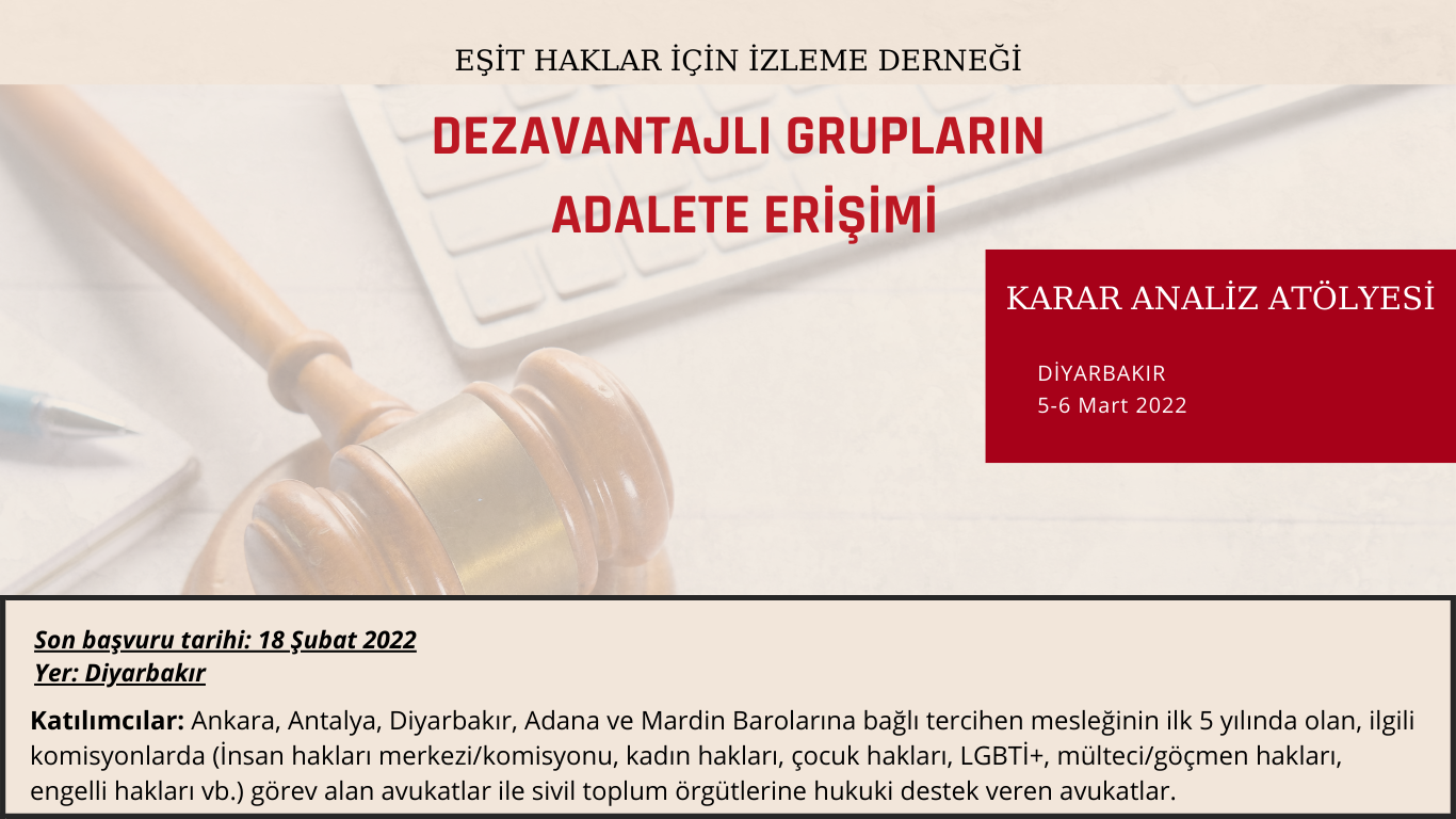 Eşit Haklar İçin İzleme Derneği (ESHİD),“Dezavantajlı Grupların Adalete Erişiminin Güçlendirilmesi” projesi kapsamında 5-6 Mart 2022 tarihlerinde baroların ilgili komisyonları ile avukatlara yönelik “Karar Analiz Atölyesi” düzenleyecektir. Katılmak isteyen avukatların 18 Şubat tarihine kadar Başvuru Formunu doldurmuş olmaları gerekmektedir.