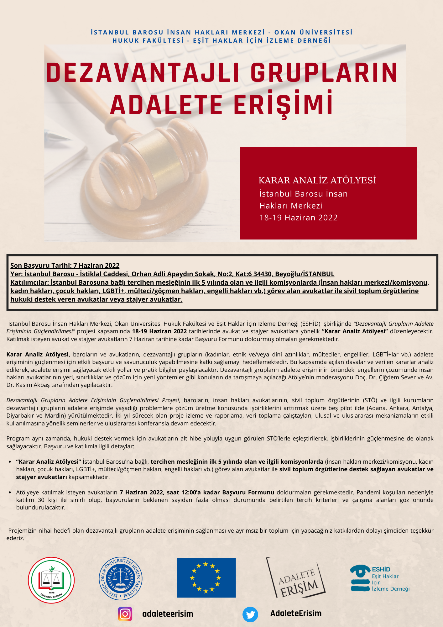 İstanbul Barosu İnsan Hakları Merkezi, Okan Üniversitesi Hukuk Fakültesi ve Eşit Haklar İçin İzleme Derneği (ESHİD) işbirliğinde “Dezavantajlı Grupların Adalete Erişiminin Güçlendirilmesi” projesi kapsamında 18-19 Haziran 2022 tarihlerinde avukat ve stajyer avukatlara yönelik “Karar Analiz Atölyesi” düzenleyecektir. Katılmak isteyen avukat ve stajyer avukatların 7 Haziran tarihine kadar Başvuru Formunu doldurmuş olmaları gerekmektedir.