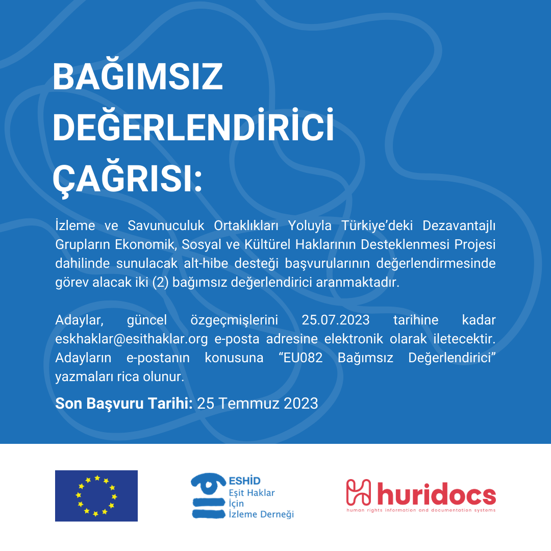 Eşit Haklar İçin İzleme Derneği (ESHİD) ve İnsan Hakları Bilgi ve Belge Sistemleri (HURIDOCS) tarafından yürütülen ve Avrupa Birliği tarafından desteklenen “İzleme ve Savunuculuk Ortaklıkları Yoluyla Türkiye’deki Dezavantajlı Grupların Ekonomik, Sosyal ve Kültürel Haklarının Desteklenmesi Projesi” dahilinde sunulacak alt-hibe desteği başvurularının değerlendirmesinde görev alacak 2 bağımsız değerlendirici aranmaktadır.