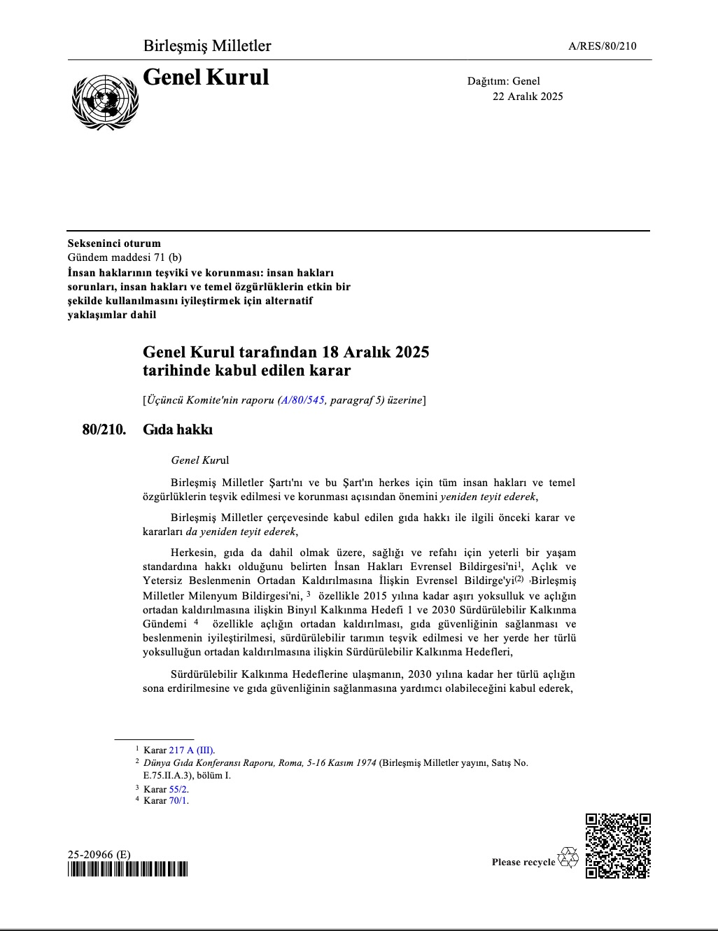 Gıda Hakkı / Genel Kurul tarafından 18 Aralık 2025 tarihinde kabul edilen karar