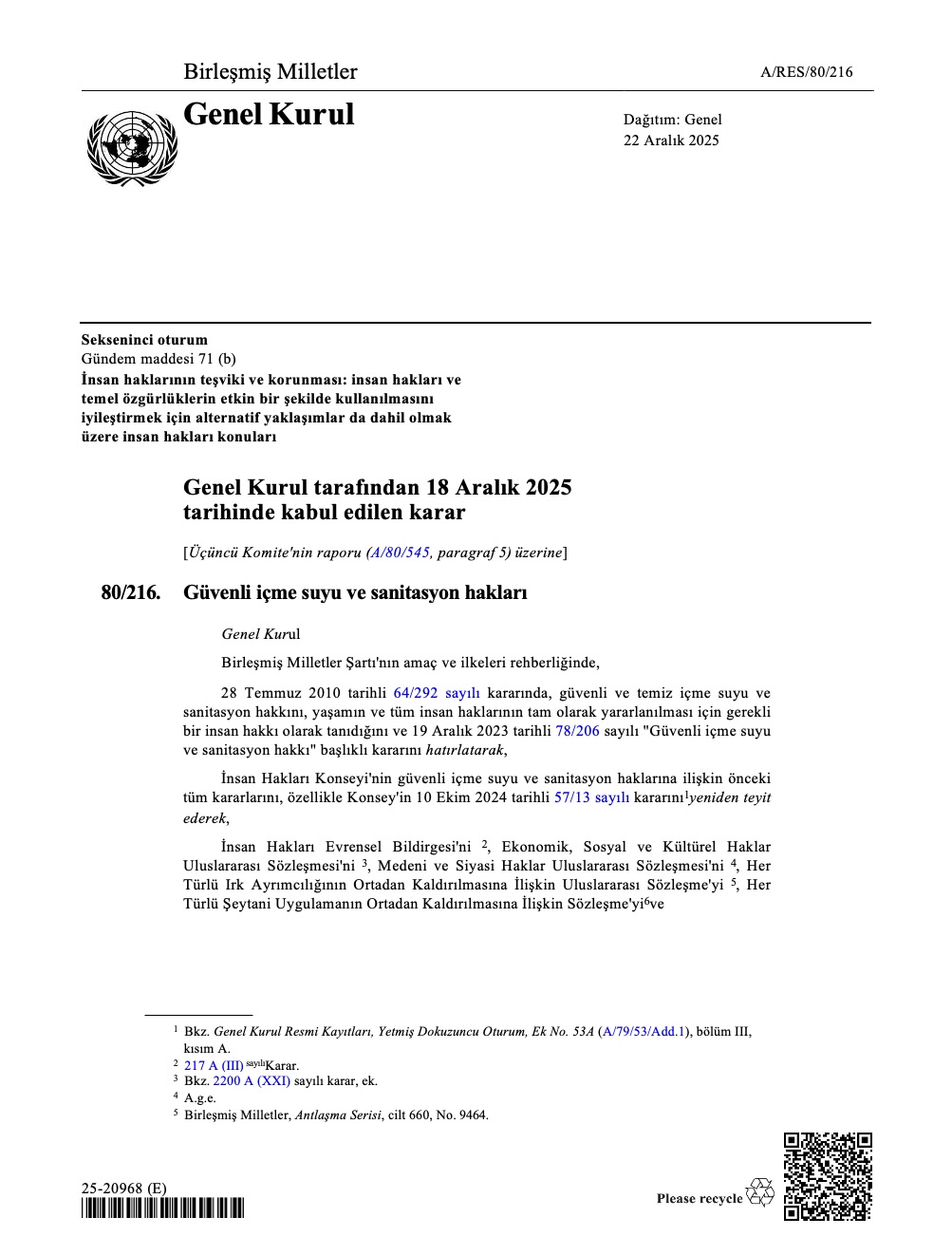 Güvenli içme suyu ve sanitasyon hakları / Genel Kurul tarafından 18 Aralık 2025 tarihinde kabul edilen karar