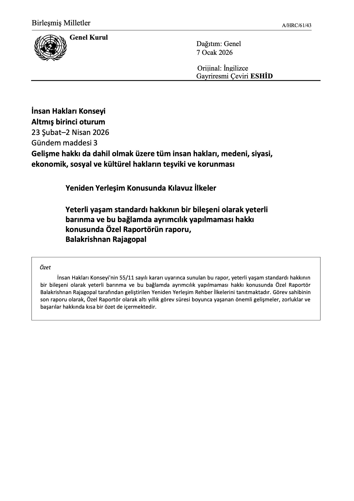 Yeniden Yerleşim Konusunda Kılavuz İlkeler / Yeterli Yaşam Standardı Hakkının Bir Bileşeni Olarak Yeterli Barınma ve Bu Bağlamda Ayrımcılık Yapılmaması Hakkı Konusunda Özel Raportörün Raporu